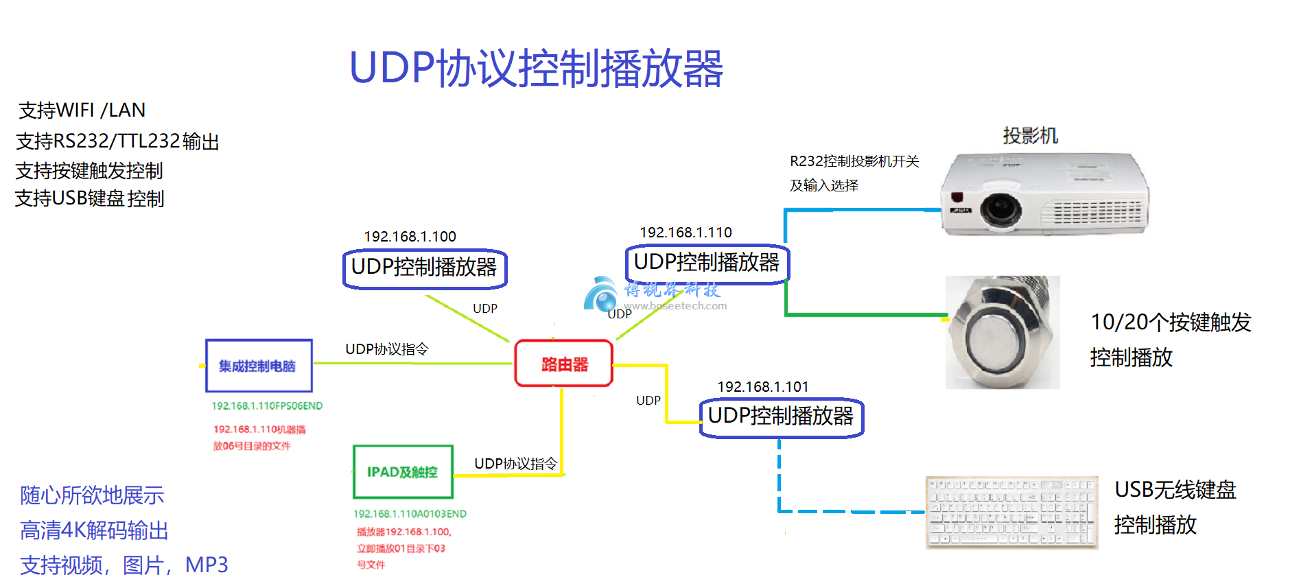 一、本中控視頻播放器,支持串口和網(wǎng)絡(luò)同時(shí)控制,協(xié)議對(duì)外,可用中控系統(tǒng)控制。