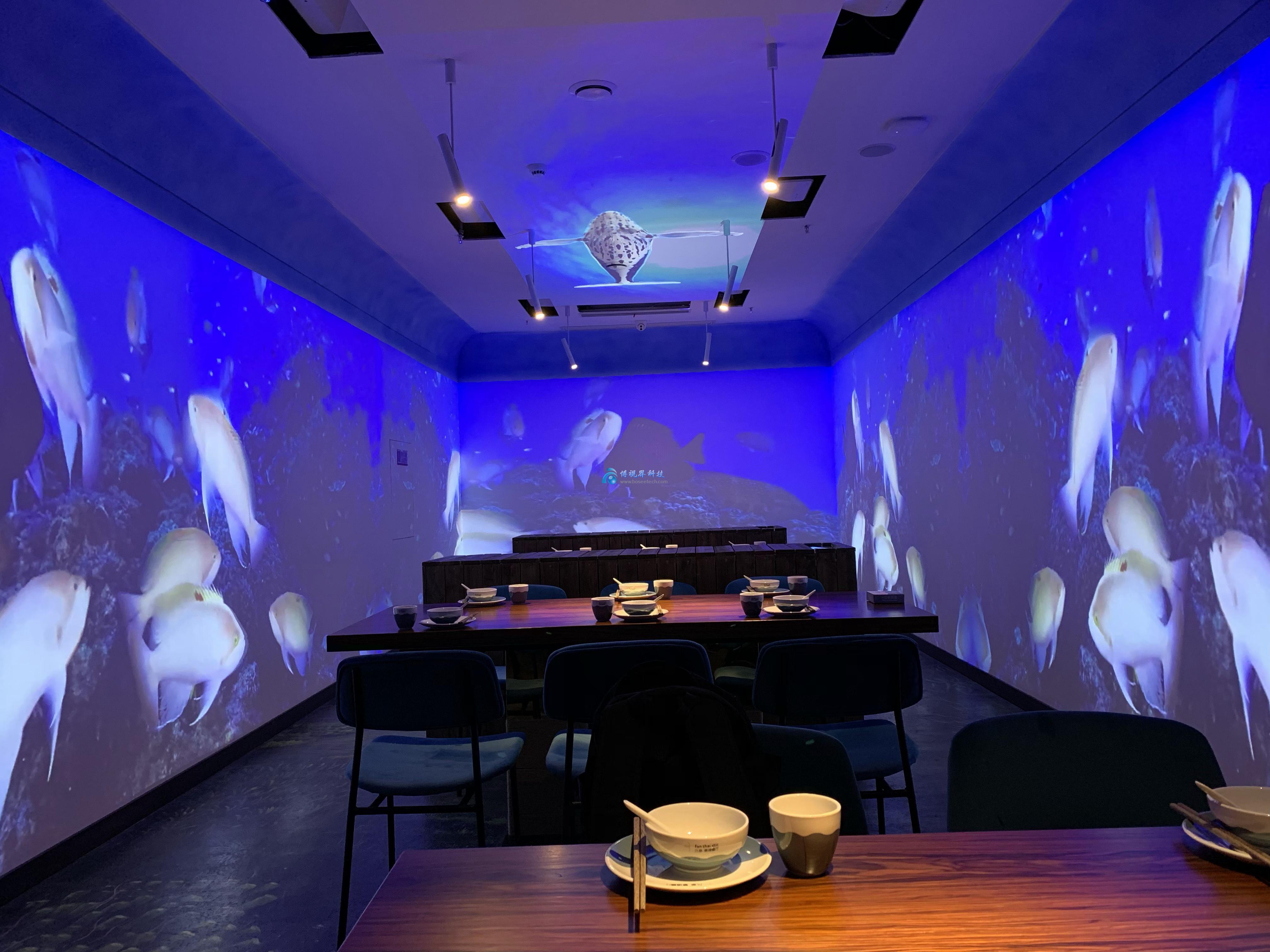 據全聚德方面介紹,光影主題餐廳是通過環形拼接和桌面投影的方式,在餐廳四圍及餐桌桌面進行激光投影;通過投影顯示設備多聯化搭建,全方位利用環境。主題場景采用三維和二維動畫的視頻制作,并進行高清效果渲染,營造沉浸式的用餐環境。