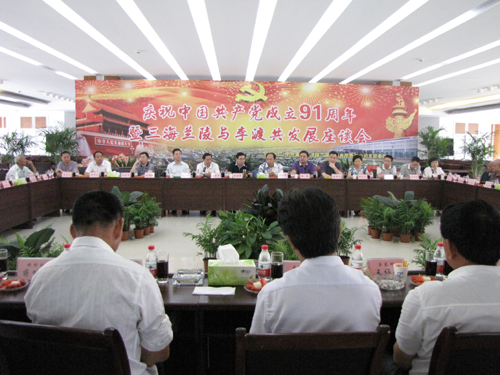 7月1日,涪陵三海蘭陵公司黨支部為慶祝中國共產黨成立91周年,邀請了涪陵區黨政領導和從1998年公司成立以來的李渡歷屆主要黨政領導10余位、李渡街道、李渡新區各村(社)黨支部書記、老黨員代表等43位,以及公司黨員20余位,歡聚一堂慶祝中國共產黨成立91周年,暢談李渡在涪陵區委、區政府以及李渡各屆、各級領導的帶領下,發生的巨大變化,共同見證三海蘭陵公司進駐李渡十幾年來與李渡共同發展的歷程。
