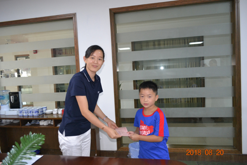 行政人事部經(jīng)理胡靜為員工子女頒發(fā)獎金