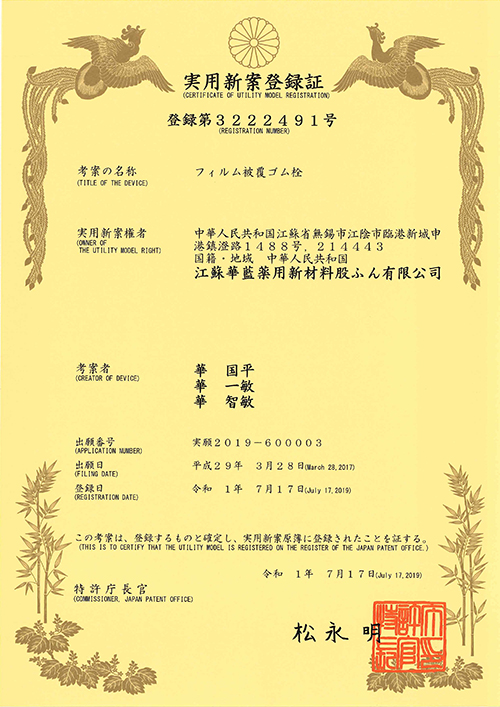 2019年7月,公司通過PCT榮獲日本實用新型專利證書——一種覆膜膠塞。
