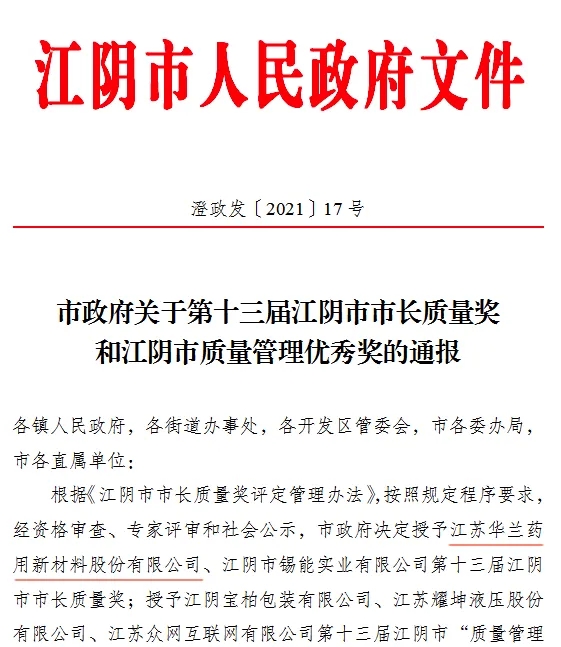 近日,江陰市市場(chǎng)監(jiān)督管理局公示了第十三屆市長(zhǎng)質(zhì)量獎(jiǎng)企業(yè)名單,江蘇華蘭藥用新材料股份有限公司榜上有名。